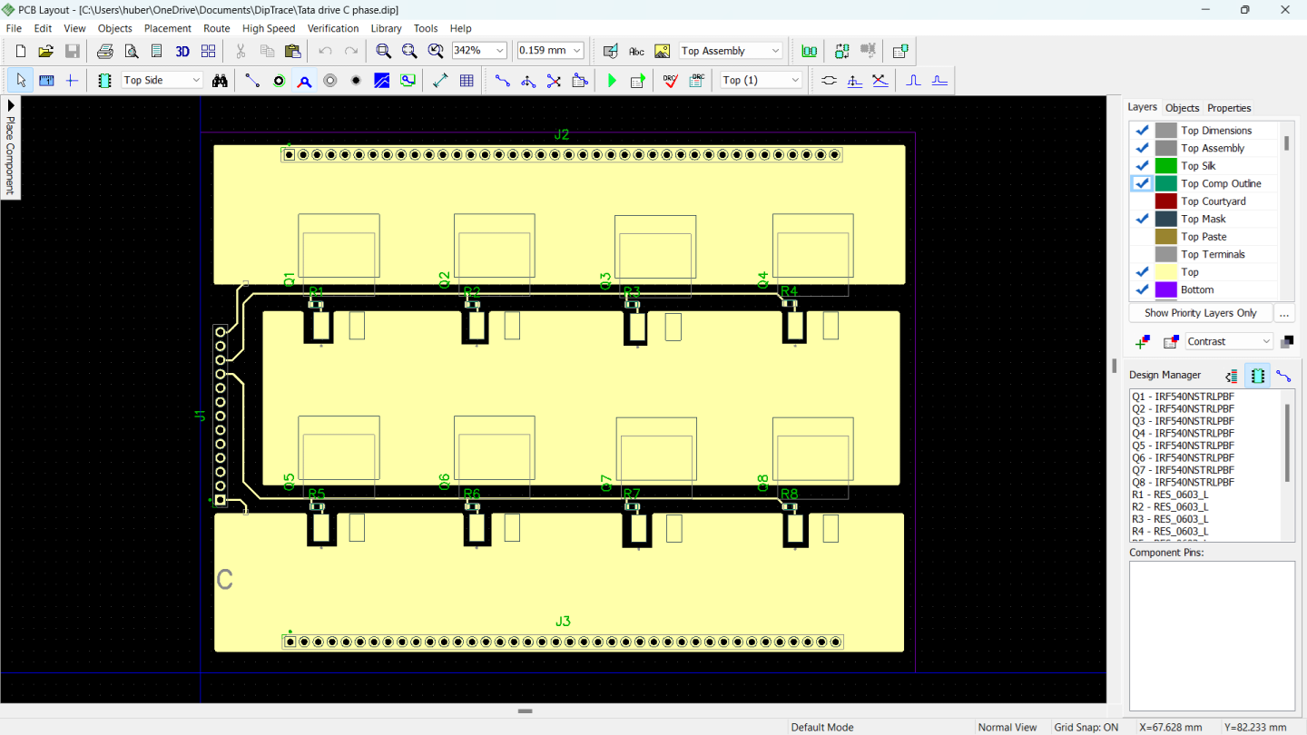 I have the three 8 FET phase single bridges half bridges complete. Now all that is left to complete is the logic PCB that contains the Mitochondrik IC and the CAN transceivers, UART connectors and LED indicators etc. Ill have these done in 8 layers so we can test for full current. The PCB footprint is 1ppoxinatel 102mm x 77 mm it will be a modular stack with a separate bridge for each phase to maximize copper within the footprint. The IRLS4030PBF are 100V 152 ampere each. There's a total of 24. You see the A AND B phases have low side current sense in the 2512 form factor I can add many along the B- rail.