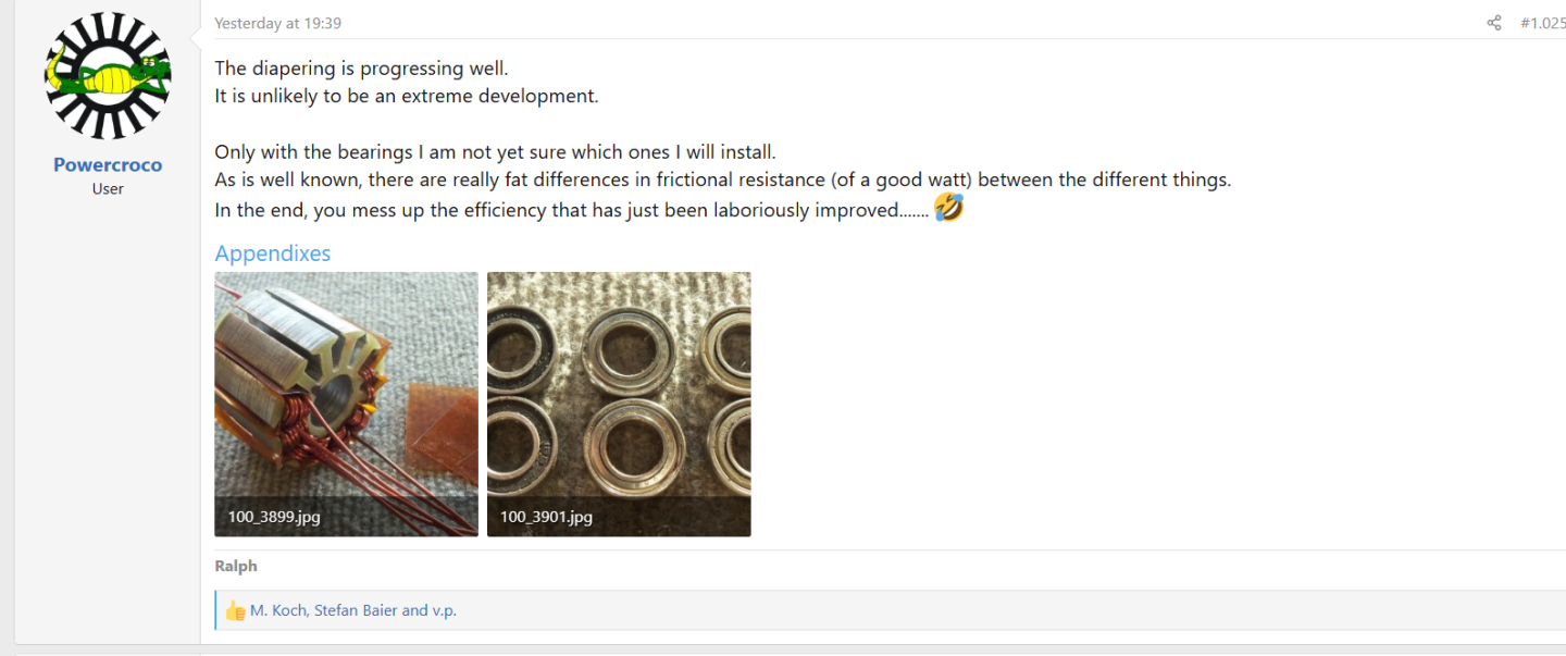 Your tuned engines are great, no question about it. If torque density is also important, sheet metal cuts with less iron have a problem: saturation occurs and the controllers lose commutation. The Lehner do not lose the commutation, even during hard accelerations in the vehicle when really high currents flow. The Heinis didn't put as much strain on the Lehner engine as necessary to show what it was all about. They're cowards. They didn't load up to the synclos. They would also have had to use a different number of turns on the Lehner that delivers the same speed under load, but they didn't. And so far no one has used a magnet system that increases magnetic flux. Flukleitkeil and Halbach magnet systems are necessary for highest performance. I also sent you the article by Dr. Andreas Grundel sent, who shows the current internal rotor with flux compression magnet system and flux barriers in the stator. I'll get the Hybried ceramic steel ball bearings and then build a Lehner 4125 with such systems with a CFRP bell, which will be lighter like the Scorpion etc. engines.