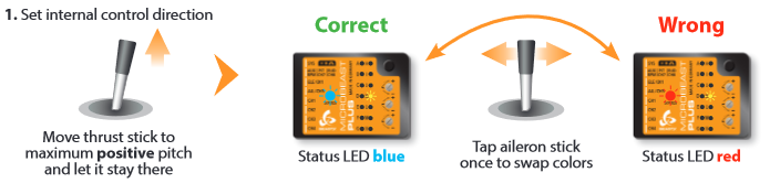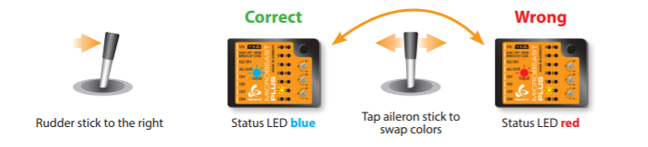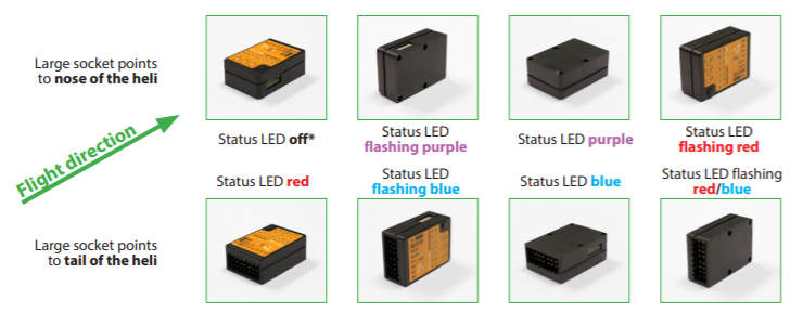 3. Mounting and Orientation. I mounted my BeastX on the gyro tray of the Huey wires facing aft. To tell this to the receiver, you'll need to power up the system. Make sure your blades are removed throughout the initial setup in case of inadvertent power-up. It will take a few a few seconds to intialize the controller. Make sure the aircraft is left stable throughout this initialization for calibration of the accelerometers. Then, hold down the programming button for 2 seconds until LED "A" is steady. This means that you are in programming mode. Move the Rudder stick left/right to change the color of the "status" LED to correspond to the device's orientation. In my chase that was Red for flat, wires aft: