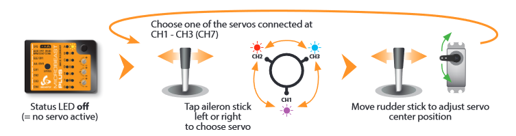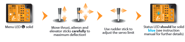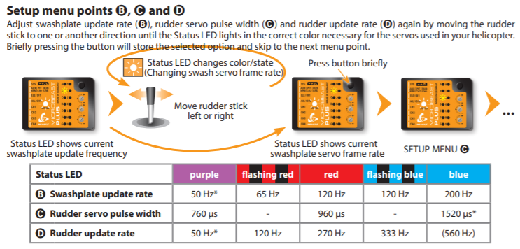 4. Servo Frequencies: Hitting the setup button again will advance the small LED to Menu "B". Menus B-D can be adjusted as shown below:
