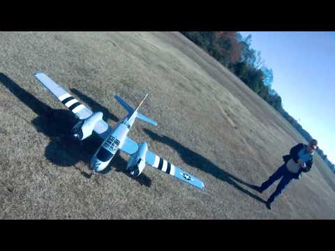 Thanks. She is heavily wing loaded. AUW is 17 lbs. Wing Loading is 41 oz/ft^2, and wing cube loading of 16. So, she's at the far right of the wing-loading and wing cube loading scales. I outfitted her with a pair of 5055 motors with MAS 14x8x3 props, with each motor/prop being driven a 6S-5AH battery. This power train gave her 129 W/lb; so, she took off and flew great. She surprised me a bit on her descent. The landing was a bit hard, and the left pneumatic retract collapsed, almost certainly due to a lack of pneumatic pressure (I've been fighting pneumatic problems since Day 1 with this plane). I think that that retract would've failed on even the smoothest of landings. I'm switching her from pneumatic retracts to electric servoless. Hopefully, I'll have her ready to fly again by early next week. Here's the unedited warts-and-all video of my maiden flight, if you're interested.Originally posted by Hardway View PostLove the A-26.... Great job. They are heavy, but so was the full-scale...