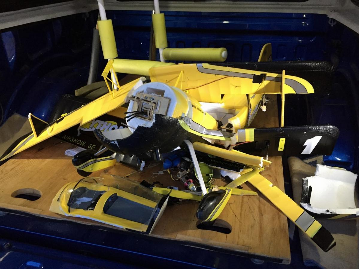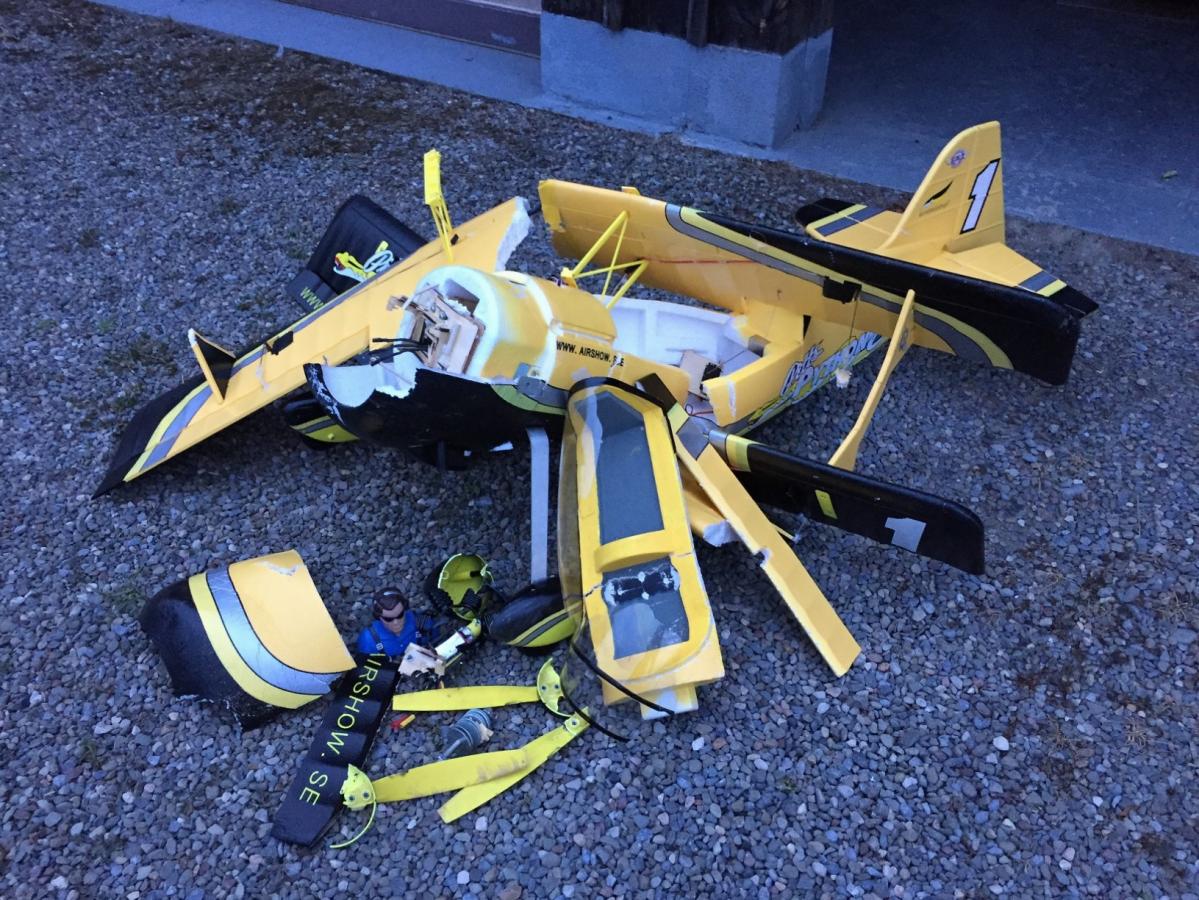 Jeez Marie - sounds horrible. Hope that the damage wasn't too bad and is repairable. Electronics should dry okay, I would think. Hope so anyway.Aeromaster 35% Extra 260 (under construction), Hanger 9 40 size P51, SIG Somethin' Extra, Hanger 9 40 size Super Stick, Eflite F4U-1A Corsair, Eflite Carbon Z Yak 54, Freewing Panther F9F, 1/5 scale Piper L4 (in box), Addiction XL (in box), Parkzone Super Cub, Eflite UM's F-16, P51, Revolution & Spitfire, Durafly Das Ugly Stick, Twisted Hobbys Crack Yak & Mini Crack Yak, Align T-Rex 600, Motion RC Avanti (under construction)