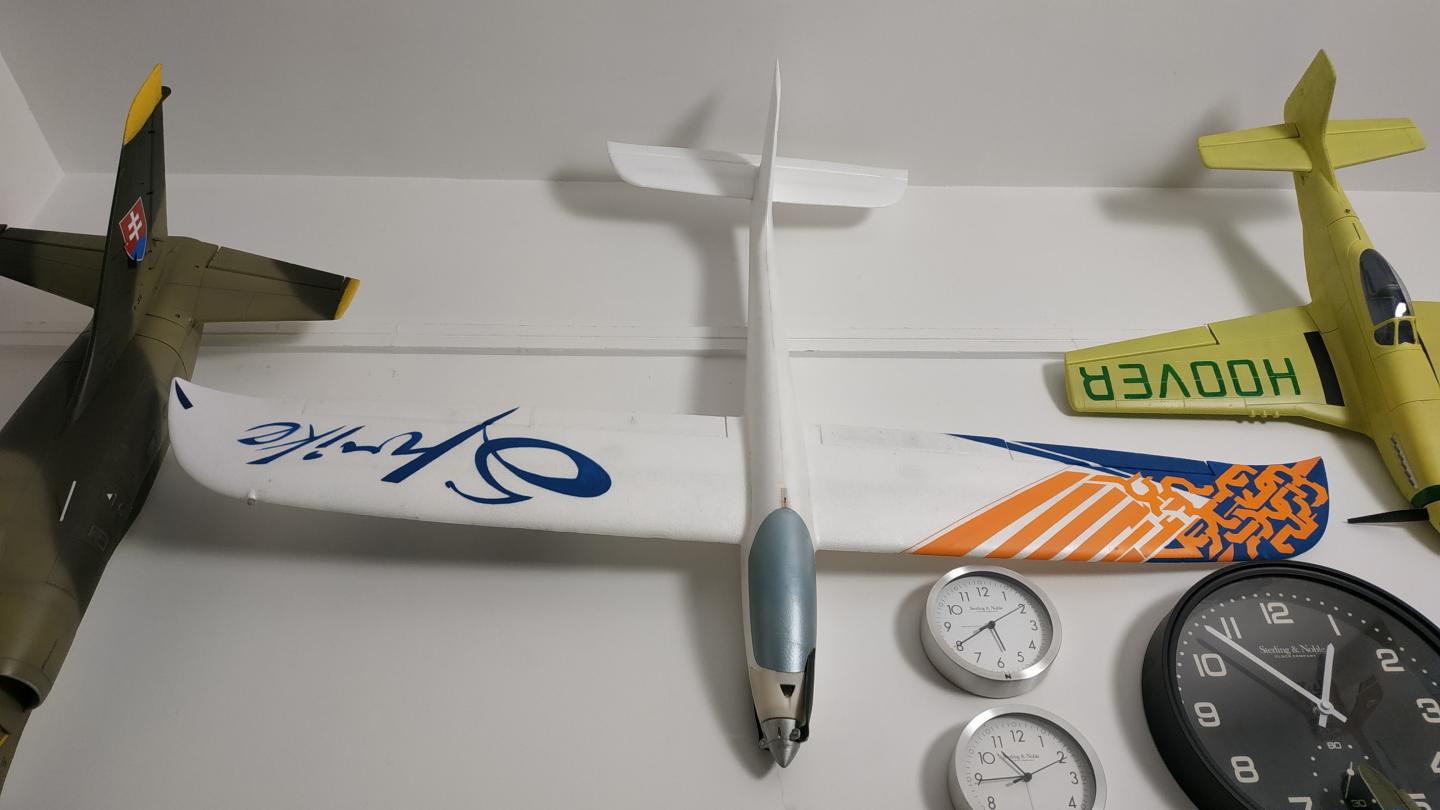 Successful maiden this evening in virtually calm conditions (wind ~ 2mph out of the North). Three flights totaling about 10 minutes airtime and 6 minutes throttle on time - battery came down @ 3.9V - (but it was not fully charged to start off with). I'm thinking this will give 15 minutes easy with mixed gliding and ripping. Much longer on a slope!