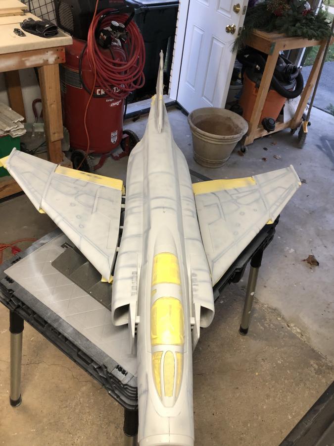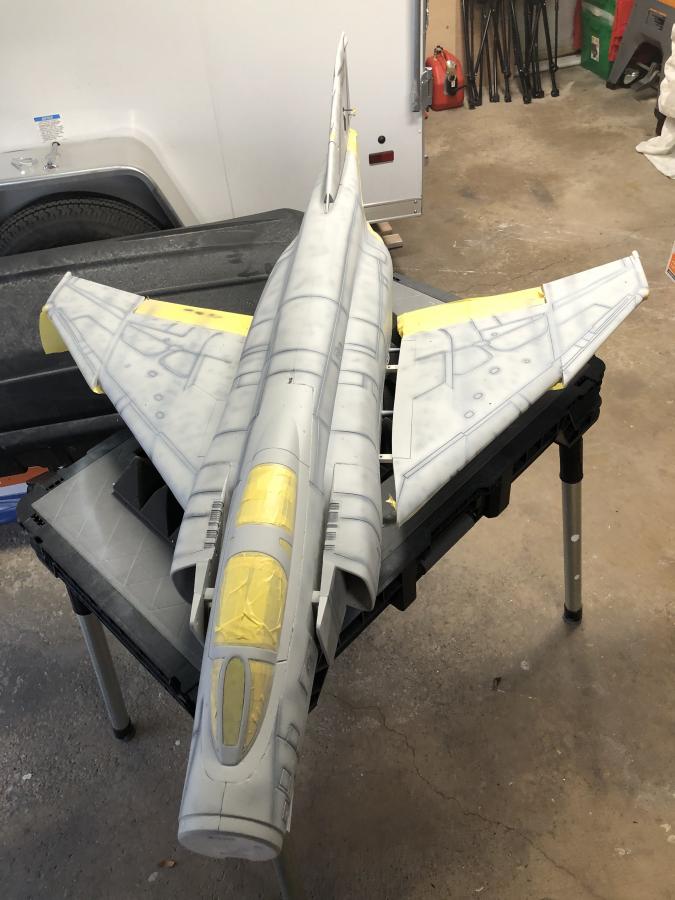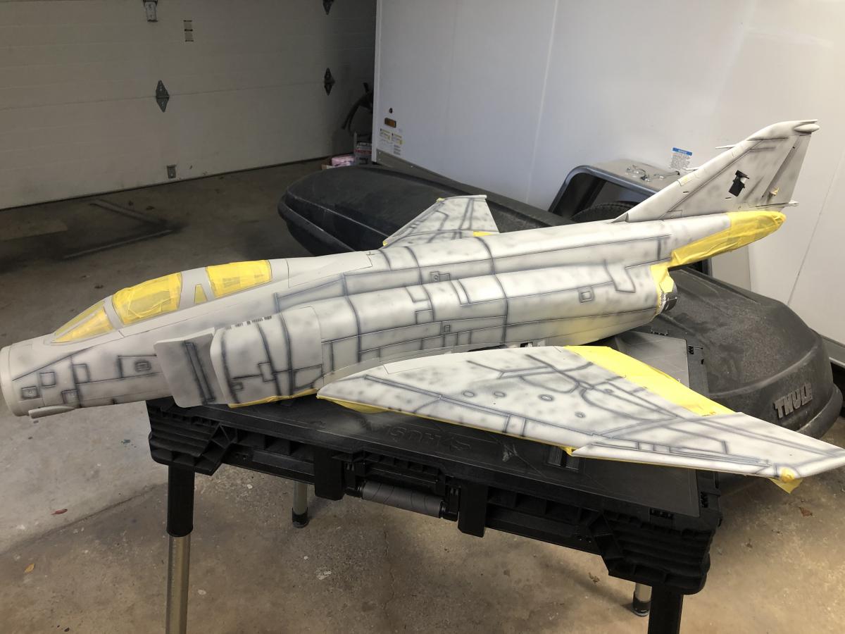 Here is the loose process of pre-shading and over-spray. The pre-shade is just Vallejo grey-green thinned for airbrushing. I tried to order the pics to show a progression of softening the starkness of the original pre-shade. I am undecided if there is more softening to do. I will take her out in the sunshine today to see what's what. Plan to hit it with Poly to prep the surface for the Callie graphics, then apply a nice flat clear to even everything out.