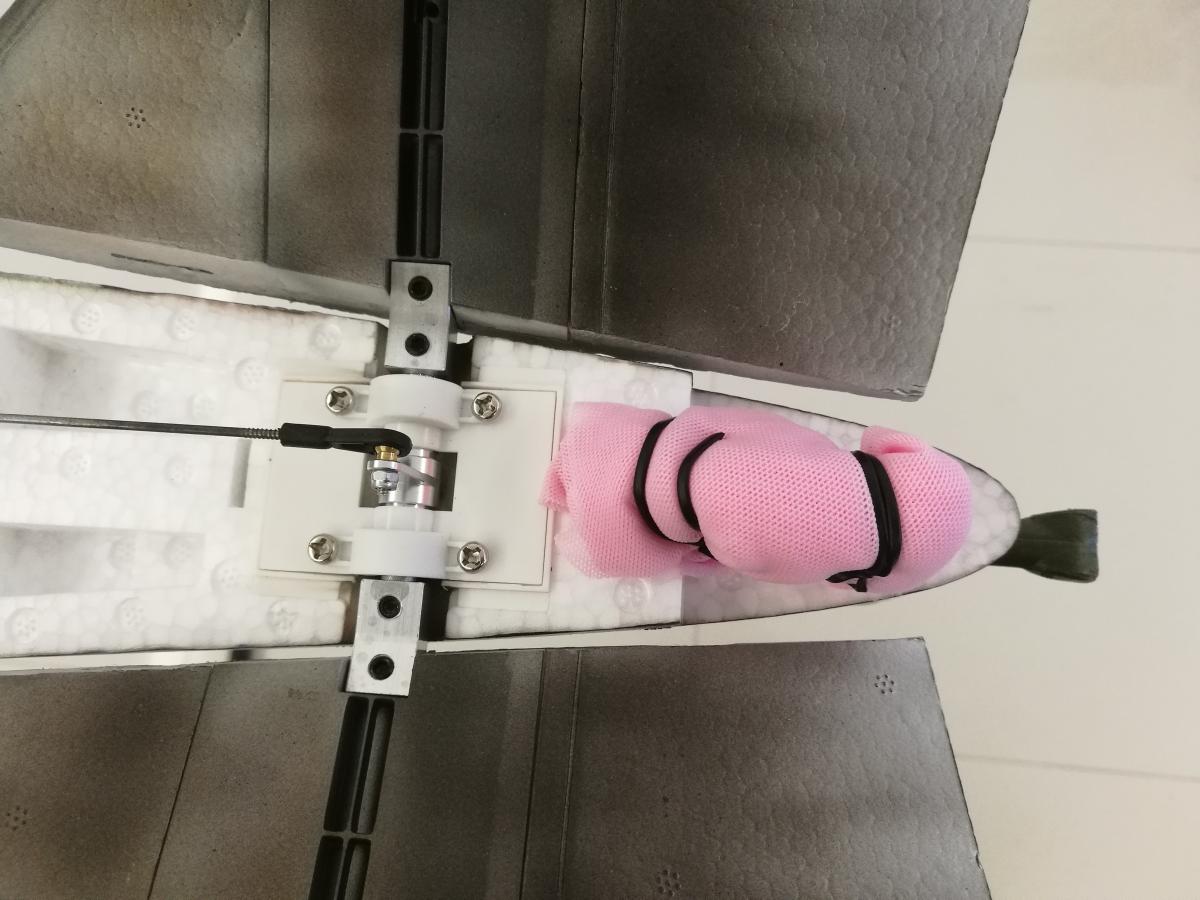 Remove the aft cover (three screws). There is lots of space opposite the elevator servo for a servo to open/close the drag chute door. You'll probably need to bend the control wire to avoid the elevator bearing housing.