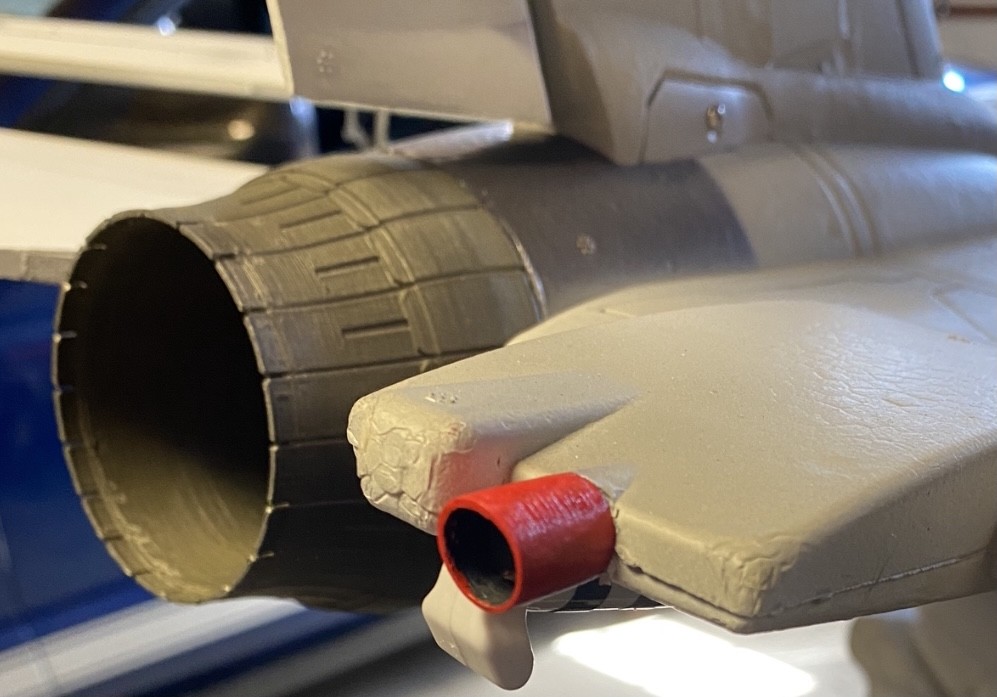 I have modeled two simple fuel dump ports, one shorter and one longer design on Thingiverse. It’s relatively quick to 3D print, glue, and paint. Below is a picture of it installed on my friends F-14. That one is the longer 15mm version shown in the picture.