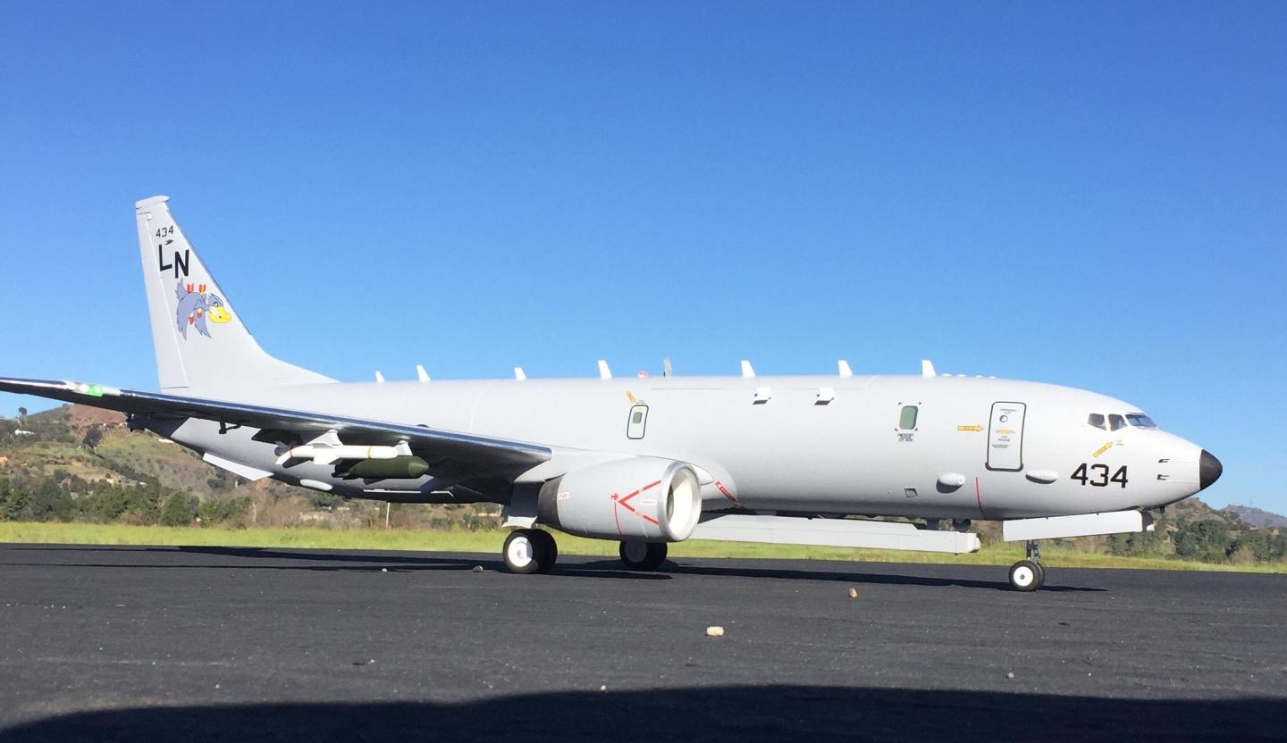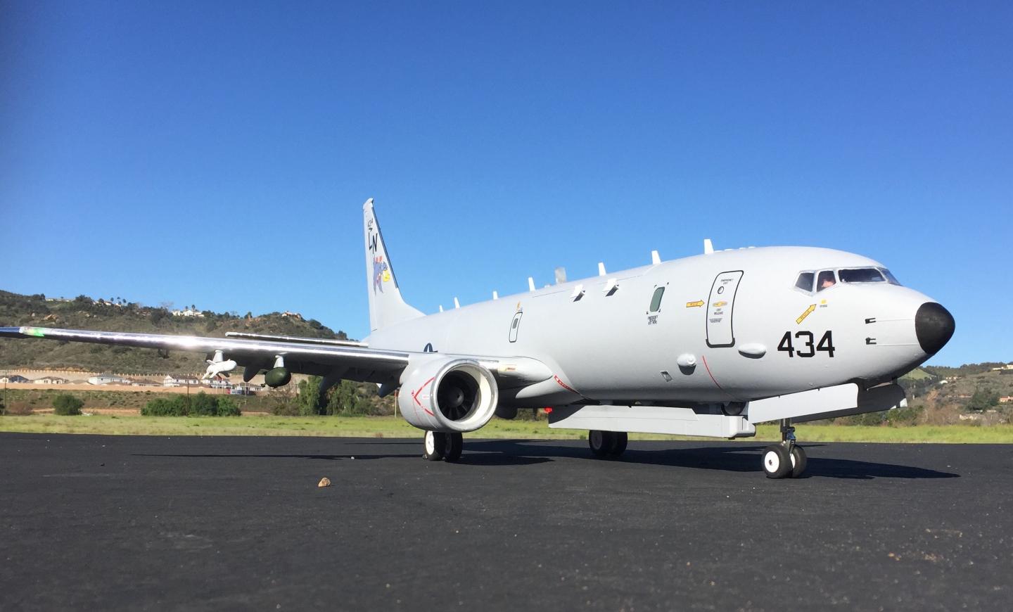 P-8 is a 737-800 Max with 737-900 wings. Mods: engine exhausts, weapons bay, wingtips, blisters, antennas, pitot tubes, GPS and satellite antennas, Harpoon missiles, Mk65 aerial mines, generator exhaust, fins, wide array radar. Behr paint, Callie Graphics, Spektrum receiver, 6000 mah batteries.