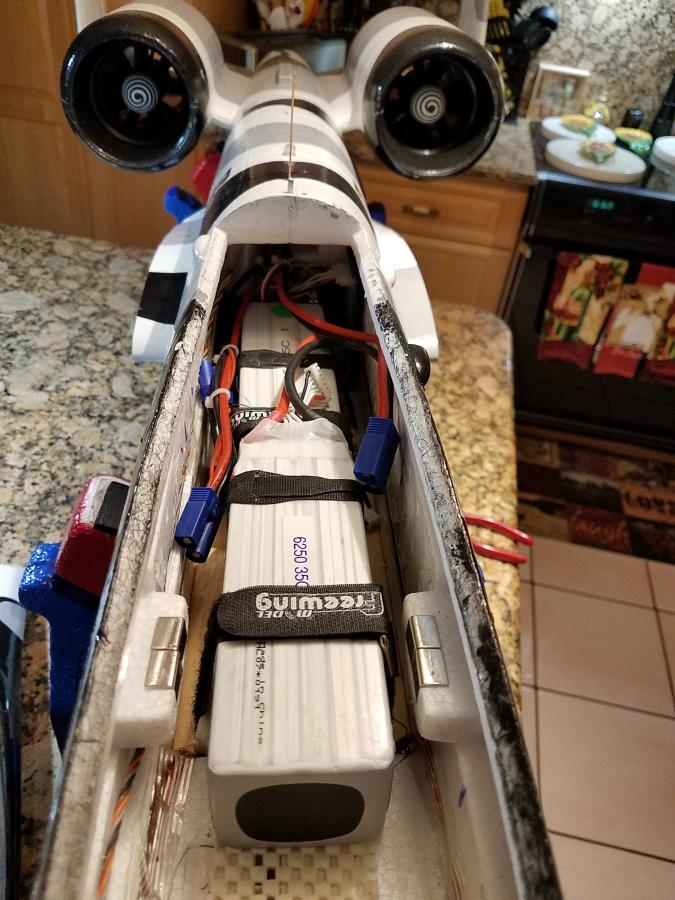 I have a set of JP Hobby 12s 90mm fans and custom 12s 10,000mah batteries from a recent experimental project. I know these huge batteries would be twice as heavy as the standard setup, but the power system should more than compensate for that in the thrust to weight ratio regard.