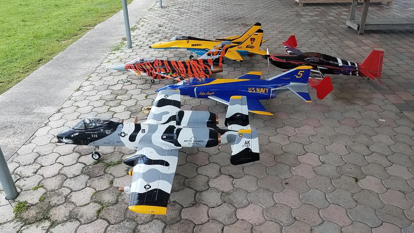 Hangar: EDF's: Mig 29 TV "Cobra", A-10 Arctic, SU-27 90mm 8S:F22 Red Lion/EuroFighterBronzeTiger/F18 Canadian & Tiger Meet/F16/F4 Jolly Rodgers & Blue Angel, 80&90 TV Avanti, Viper, Stinger 90. Props: 1600 Corsair & Spitfire, B-24, 1700 P-51, 60" Beast & P2 Bipe, Extreme Flight-FW-190 Red Tulip, Slick 60, 62" Extra 300, 62" MXS Heavy Metal, 62" Edge