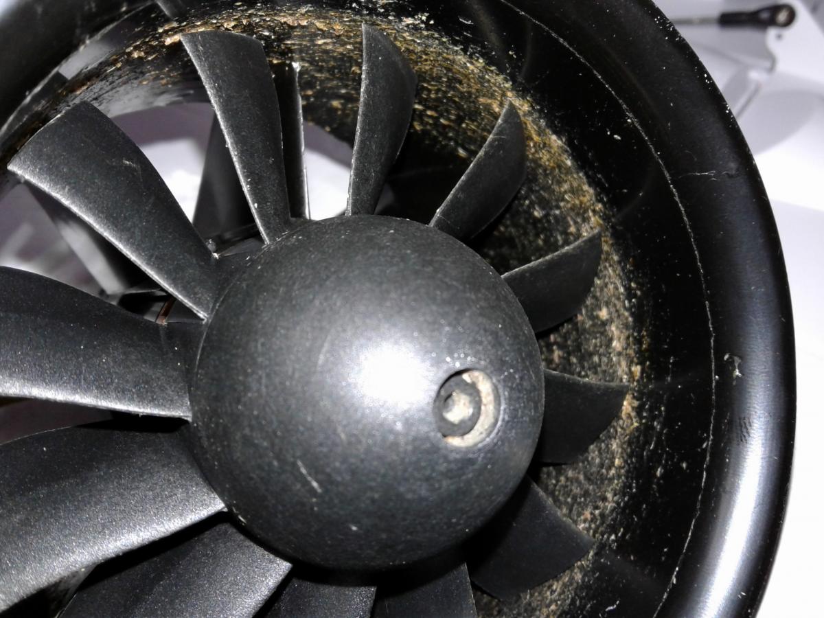 Got home, opened up the engine compartment to find the fan full of gunk from the grass field. Amazing how much stuff gets sucked through that fan. I also repaired an aileron hinge which had kind of worked loose at some point. I used the Freewing glue from the kit to fix the aileron hinge. It worked great. Otherwise not much maintenance required on this bird. She still looks like new.