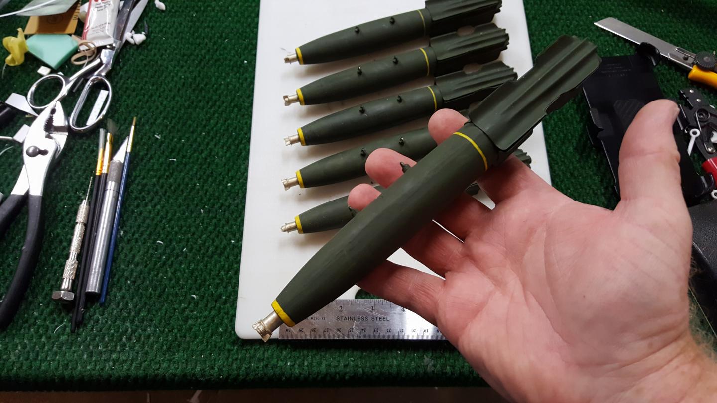 They come from Jet Hangar Hobbies. They are a bit pricey but they sure do look good. They come un-assembled and are very light. Each one takes about 2-3 hours to assemble and paint. At 1/10th scale they are only slightly smaller than what will fit the A-4. The fins are a little different than the ones in the image I am trying to duplicate but thats ok.Originally posted by Pheonix View PostWhere did you get the ordnance load from? Looks very good.