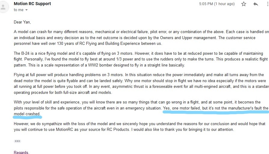 happens. To my pleasant surprise, they agreed to give me a credit for an ARF, as the EDF and ESC were fine from the crashed F-4. I had no video or photographic evidence (other than pics of the destroyed F-4 after the fact) to back up anything that I claimed happened either. They really stepped up to the plate for me, probably more than I would have done if I was the customer service rep, even though the servo failure was early on and critical to the accident. I can see why they replaced the jets on all the early F-18's that went out with elevator servo "cut" wires, and all the credit to them acting quickly and decisively, not something any other dealer IMO would have done.