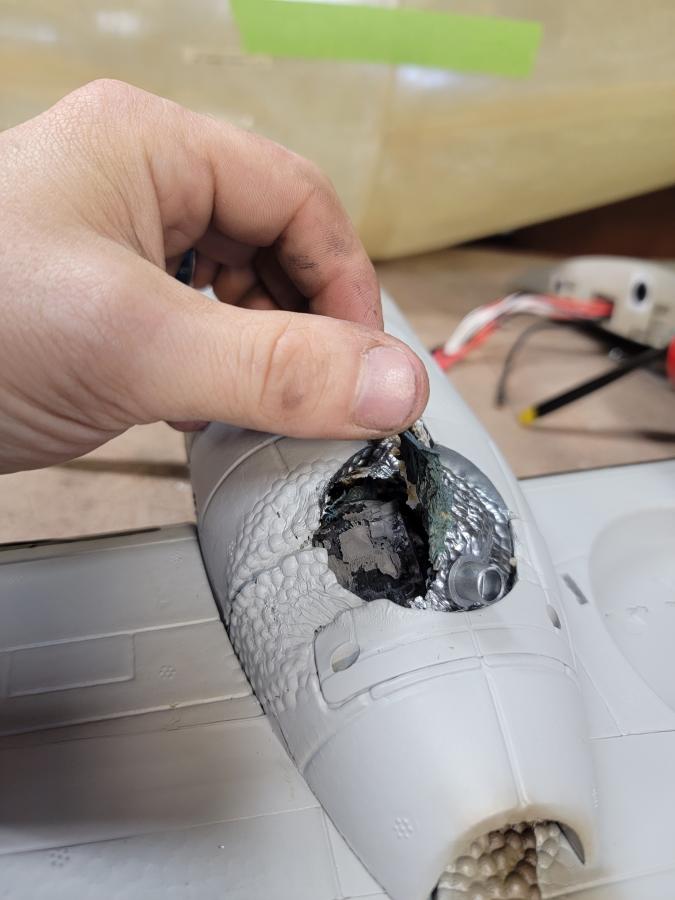 to slow it down with one throttle blip in the middle to see if i could pull out. Ultimately it didn't pull out and damaged the nose, nose gear, right wing retracts, right wing mounting tabs, carbon spars and small parts, wings rudder and elevator seem to be in good shape. At the crash site, i pulled the batteries assessed the damage only to find out the right-wing outboard esc had failed causing the spin and most likely the hard right pulls prior. I have attached all the pictures of all of the aircraft so you can assess the damage for yourself. I uploaded the flight video to Youtube to be able to share. I dont upload much on YT so forgive my video skills.
