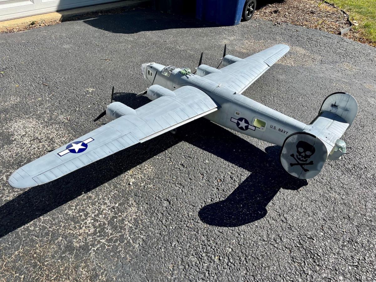 I bought a used B-24 last year in silver livery, I've repainted to represent a US Navy PB4Y-1. Decals are custom from Callie, I found these markings on a scale model site, they are fictional "Dem' Bones". I don't believe the USN had any 24s with Jolly Rogers on the tail. Painted black first and then airbrushed with Vallejo Air Insignia White 71. 279 on bottom and then Dark Gull Gray 71.277 on top. I haven't flown it yet. I'll be running 2x 3S 4000 packs with MAS 8x6 props.