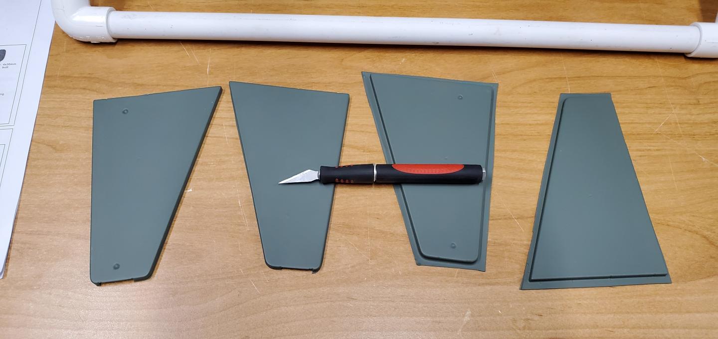 The main landing gear is next. These are pretty stout aluminum gear legs. I opted to paint mine dark green before installing. The green I used is darker than the covering, but since most of the gear legs are covered with the skirts, it looks good. You will need to cut out the plastic skirts for the gear. The manual shows a picture of scissors for this step. I recommend using a sharp razor knife (X-Acto or similar). Take your time cutting these out. By using the razor knife, you can make a couple score cuts along the corners of the skirts and then simply peel off the excess plastic for a nice even finish. The skirts are designed so that one part fits inside the other, to make installation on the gear legs cleaner.