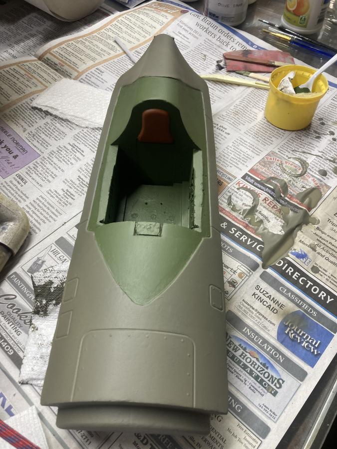 Put my last spray coat of OD on today and mixed some darker int green paint. Painted the cockpit aera and inst. panels. Hope this looks more like the Republic green used at their factory.