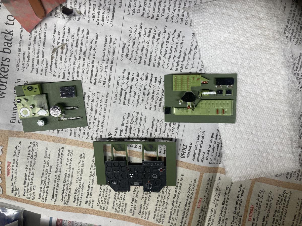 • Put my last spray coat of OD on today and mixed some darker int green paint. Painted the cockpit aera and inst. panels. Hope this looks more like the Republic green used at their factory.