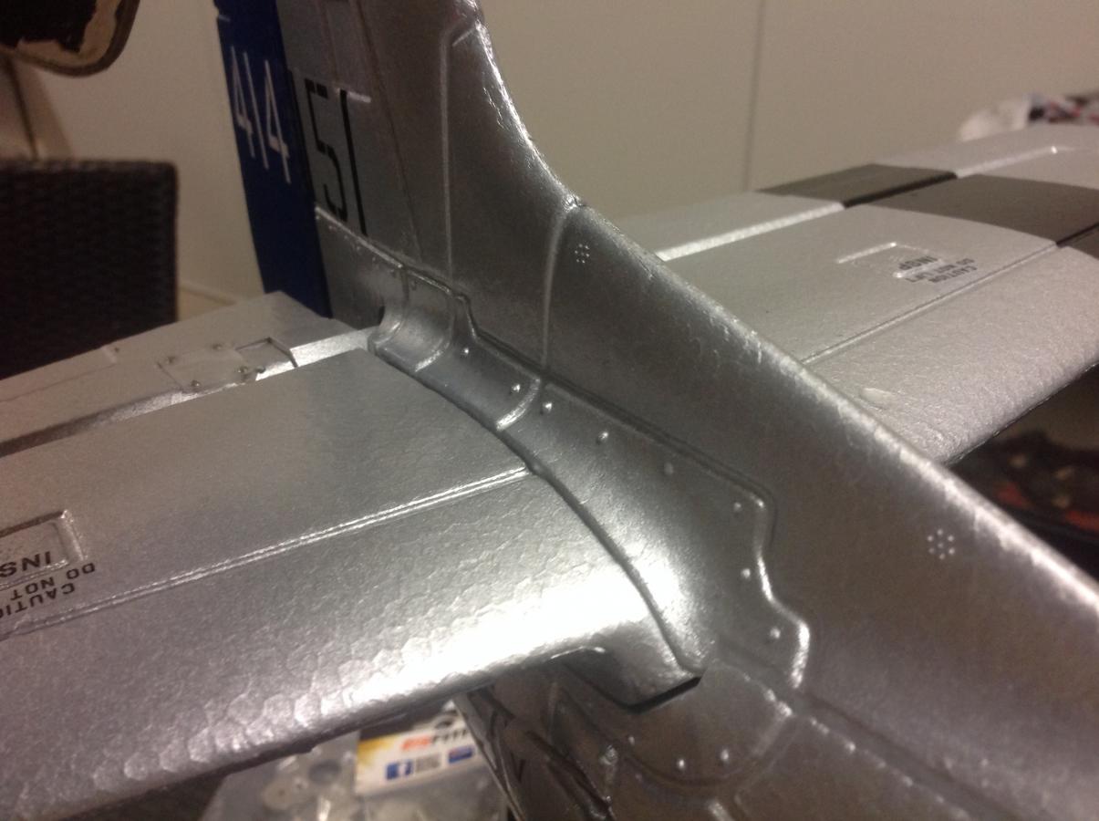 First, check the elevator/horizontal stab for any side to side movement. One thing that all my mates and my mustangs show is they have a bit of side to side movement here. As part of my build on these I glue this stab in along the joins to reduce any flex or just loose fitting movement. All my mates with these have done this as well. It varies model to model, this one wasnt too bad but my mate Alan's redtail was terrible until we glued it. If it flexes or moves side to side, it'll make your tail wobble all over the place (esp at speed), and maybe this will help.