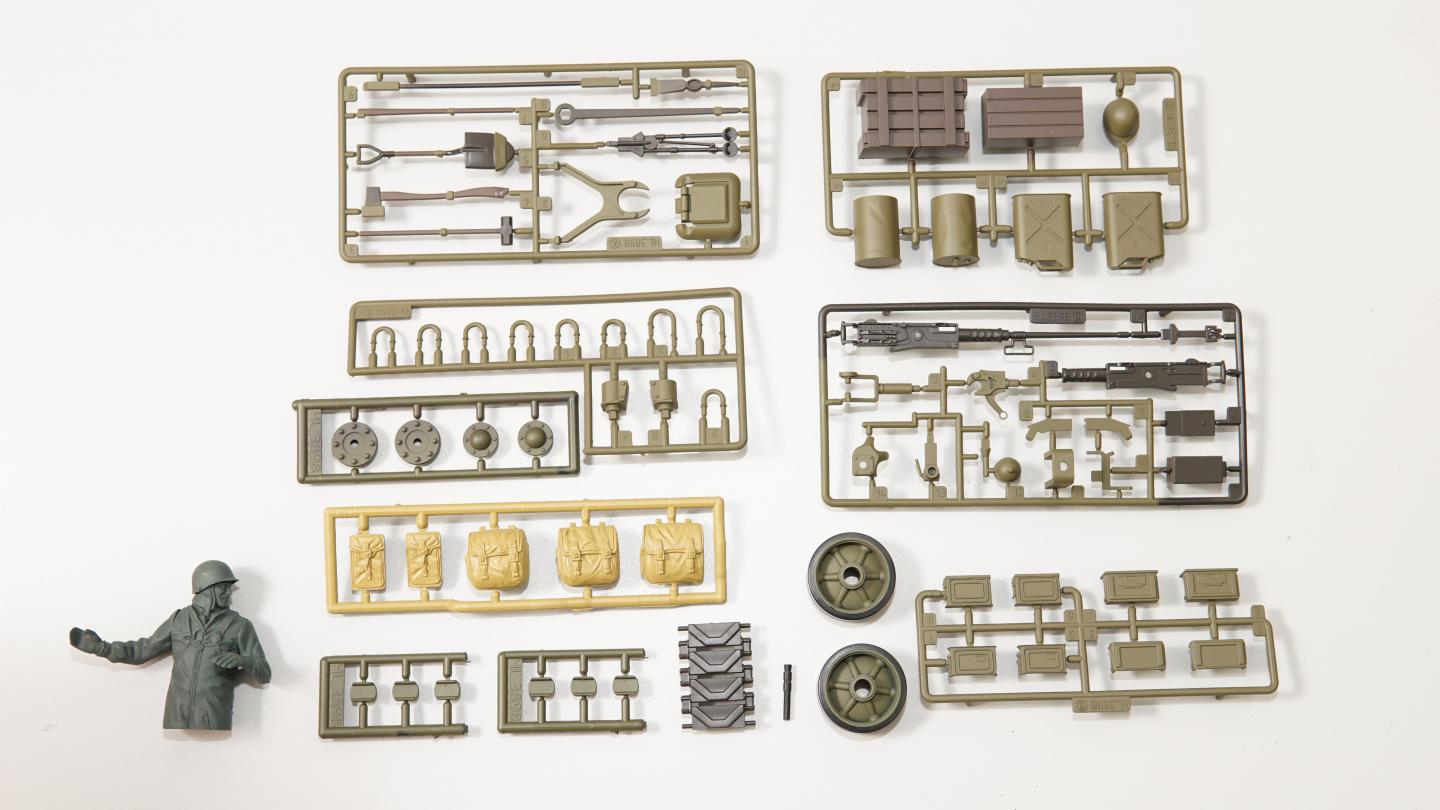Nine "Cosmetic Spare Parts" sprues and a few loose parts are provided, as shown below. Several of these are designed to plug into pre-drilled holes, and for the most part are "snap fit". ABS glue can be used to adhere the parts permanently, but I prefer to keep them unglued, except in areas where I don't expect to ever have to remove the part for painting or transport. The Sherman's engine deck and front glacis are where most of the "snap fit" parts attach, such as the pioneering tools and ammo storage rack. However Heng Long chose to minimize the number of pre-drilled holes, opting instead to attach the stowage parts (ammo cans, bags, boxes, fuel can, spare wheels and tracks) with double-stick tape.