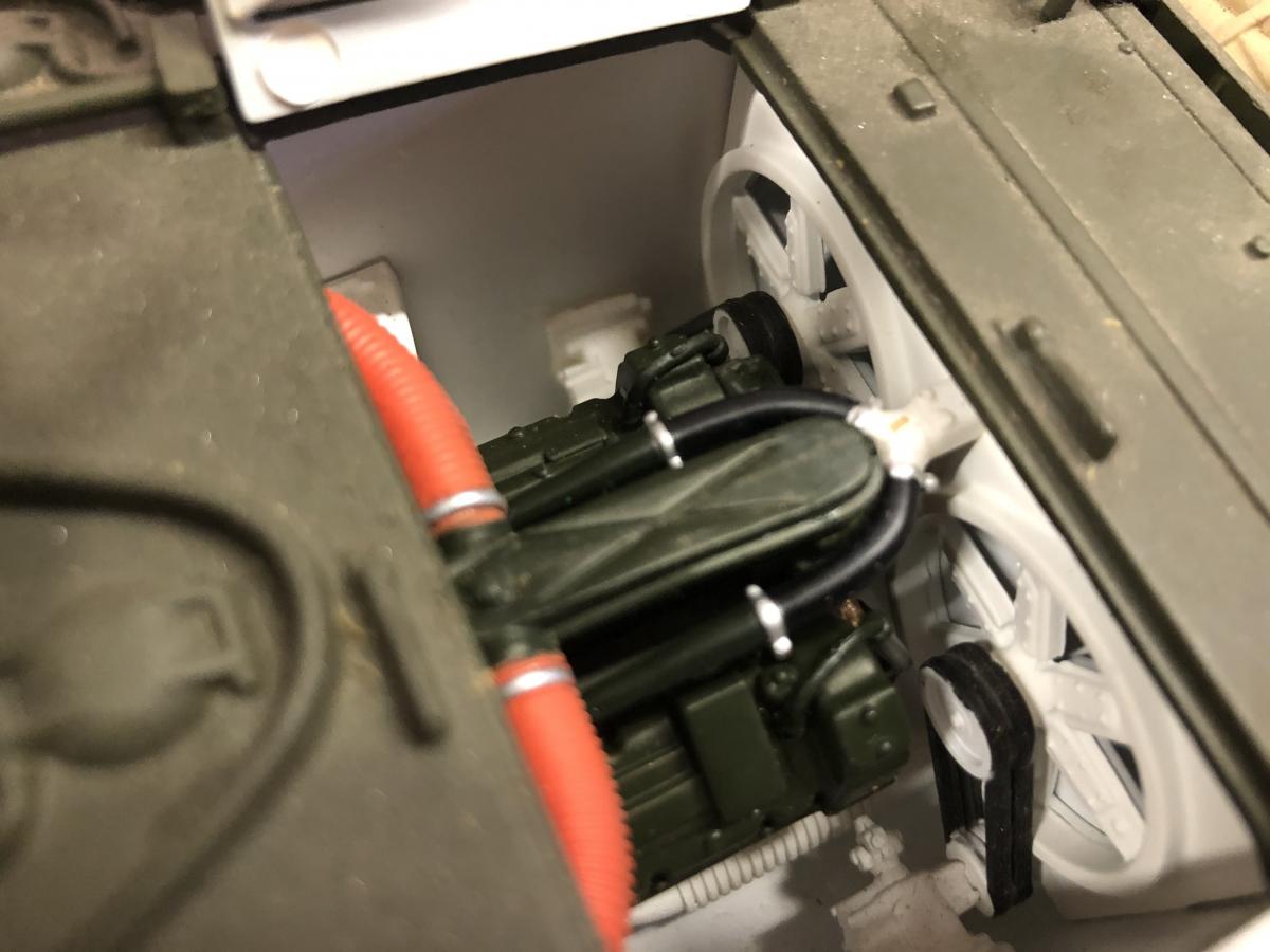 A glycerin based "smoke effect" is expelled downward through the same exhaust location as the real Sherman. Adding a couple drops of glycerin oil every hour or so is a minor hassle since you need to invert the tank at a 45 degree angle, but the Sherman is light enough to pick up with one hand to accomplish the task.