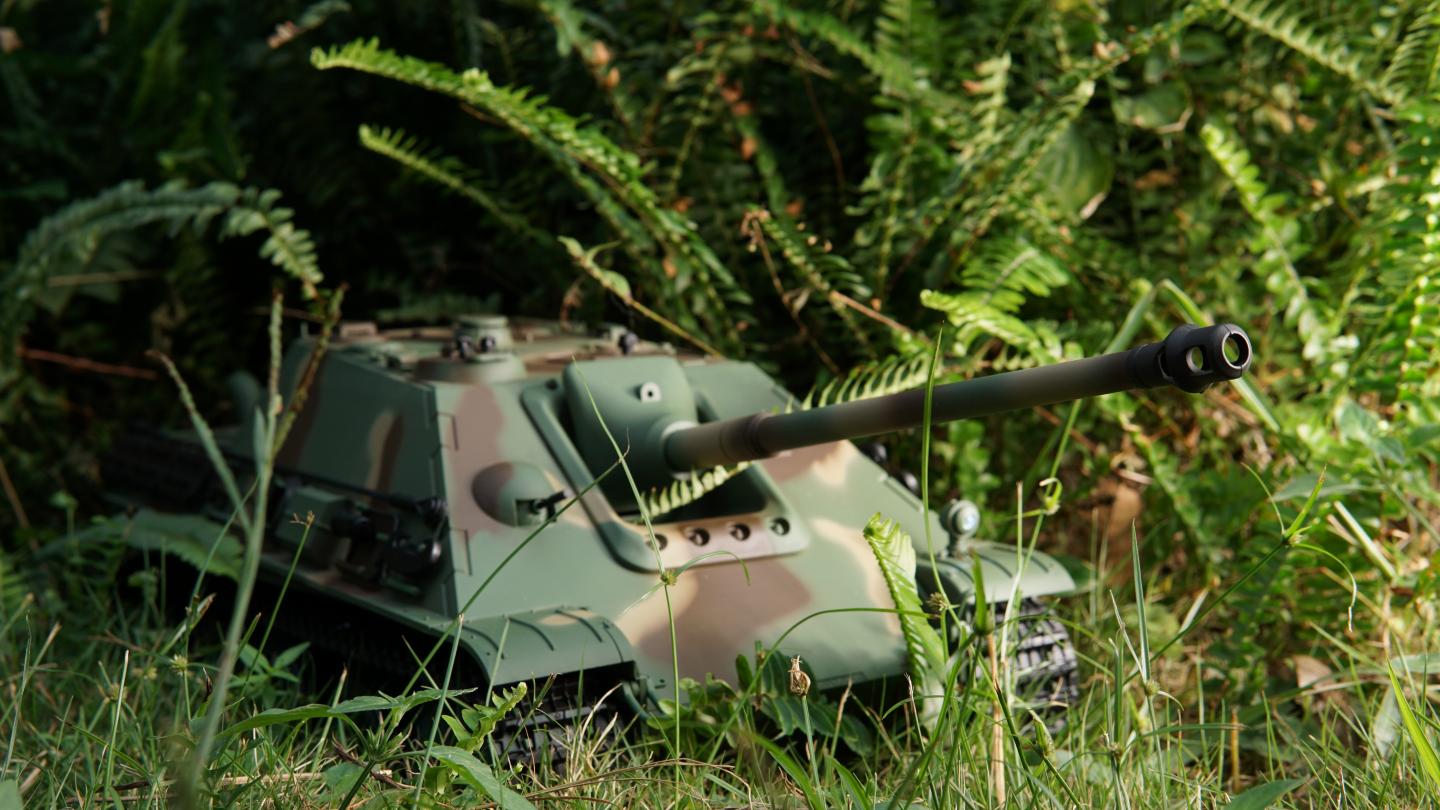 The most fun I've had with all these recent Heng Long tanks is engaging in IR Battles with other tanks equipped with the same TK6 MFCB. Whether a BB is loaded or not, firing the main cannon will always trigger the cannon sound and the track recoil, and will also always trigger the IR (infrared) emitter that's hidden in the mantlet, facing forward. This IR emitter sends an invisible beam that is detected by the IR mast that connects to any other TK6-equipped tank or Tamiya IR battle system equipped tank. The mast connects magnetically to the turret, and receives "hits" from other tanks. Registered hits result in the tank shuddering for a split second. After five hits, the tank plays back an "explosion and burning sound", then shuts down for five seconds, before powering back up automatically so you can resume battling your friends. A backyard brawl with four or five tanks is serious fun! Maneuvering and angling for a shot while driving for cover, all the while shouting taunts to your friends, becomes very competitive very quickly. Because this tank destroyer lacks a rotating turret, its role is better served as an ambush predator, lurking on station concealed in foilage until its prey comes within range.