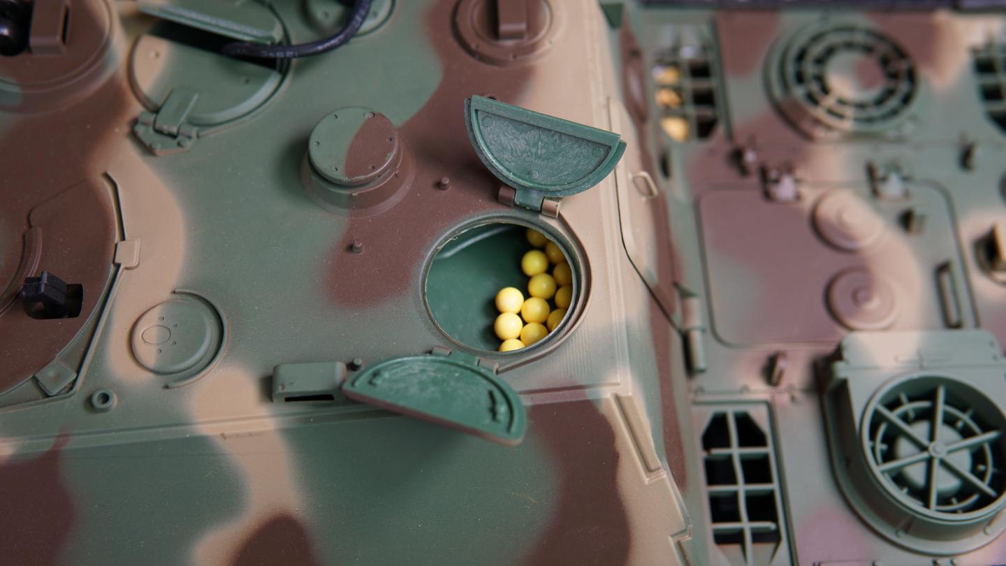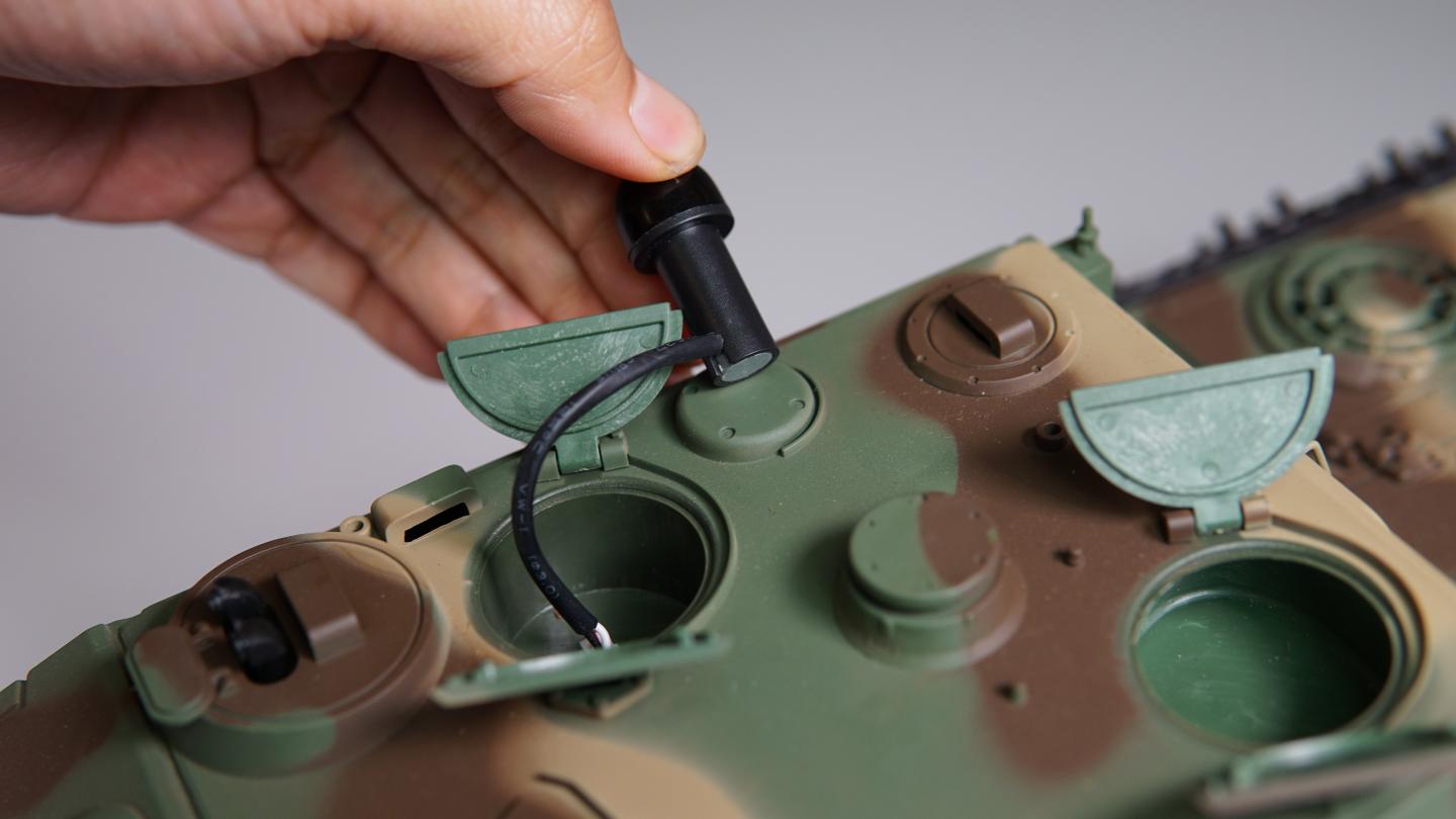 If you plan on battling your friends with the included IR (infrared) system, plug in the IR apple and locate its magnetic anchor spot in front of the hatch. Heng Long's magnets are concealed inside the turret and thus there isn't any unsightly mount visible from the outside of the turret. The IR apple is low profile, and reasonably sensitive in overcast conditions out to ~10-15 meters. The Jagdpanther's mostly flat upper casement is free of any tall obstructions.