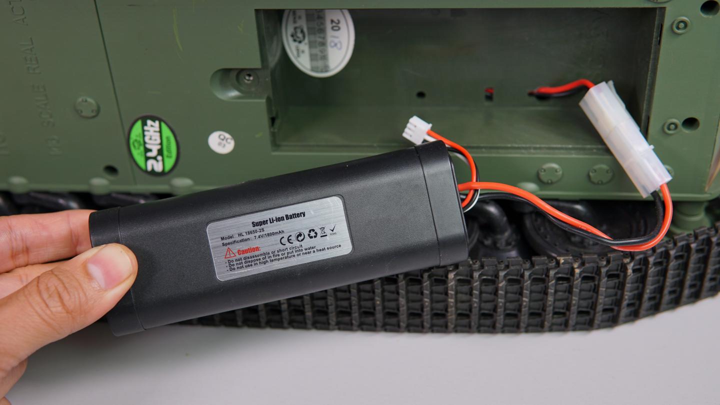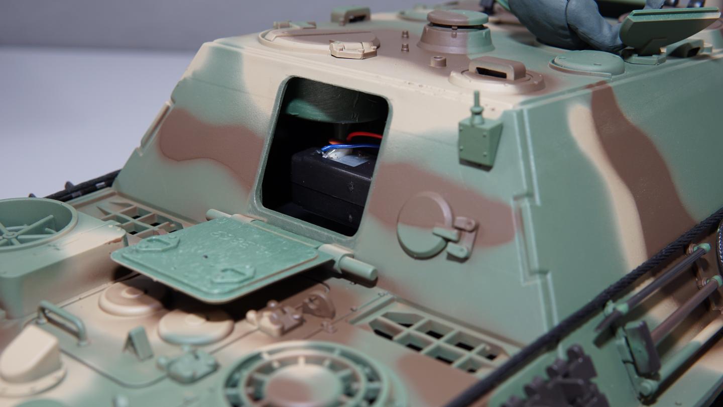 Plug the battery back into the battery bay under the tank. I like how Heng Long designed the screw to always stay connected to the battery bay door, so it's impossible to lose that little screw. The 2s 1800mAh battery uses a Tamiya-style connector for main power, and also has a conventional three wire balance plug. I've found this to be convenient for checking the battery voltage with my battery voltage checker, just as I do with my larger airplane batteries. Heng Long's system will automatically shut down when the battery is depleted, although I prefer to use a low voltage alarm to notify me before that happens. There is ample space inside the Jagdpanther's battery bay to fit a small low voltage alarm if you choose to do the same.