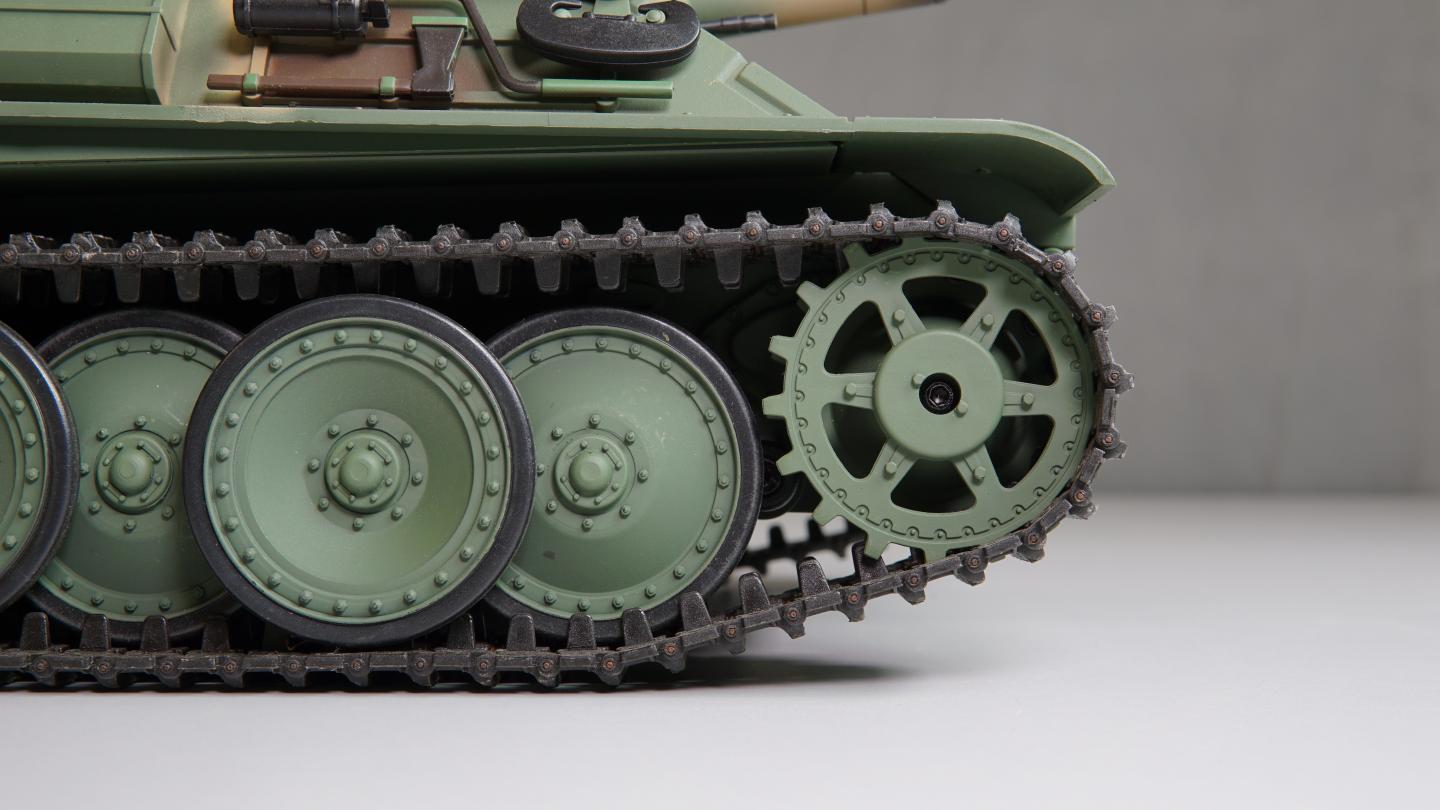 The lack of an adjustable idler and metal suspension arms identify this as one of Heng Long's earlier molds. It still stands up to the test of time in certain respects, but its interleaved road wheels will always be more prone to clogging, just like the real Jagdpanther. Maintaining it is easy because of its lack of a moving turret.