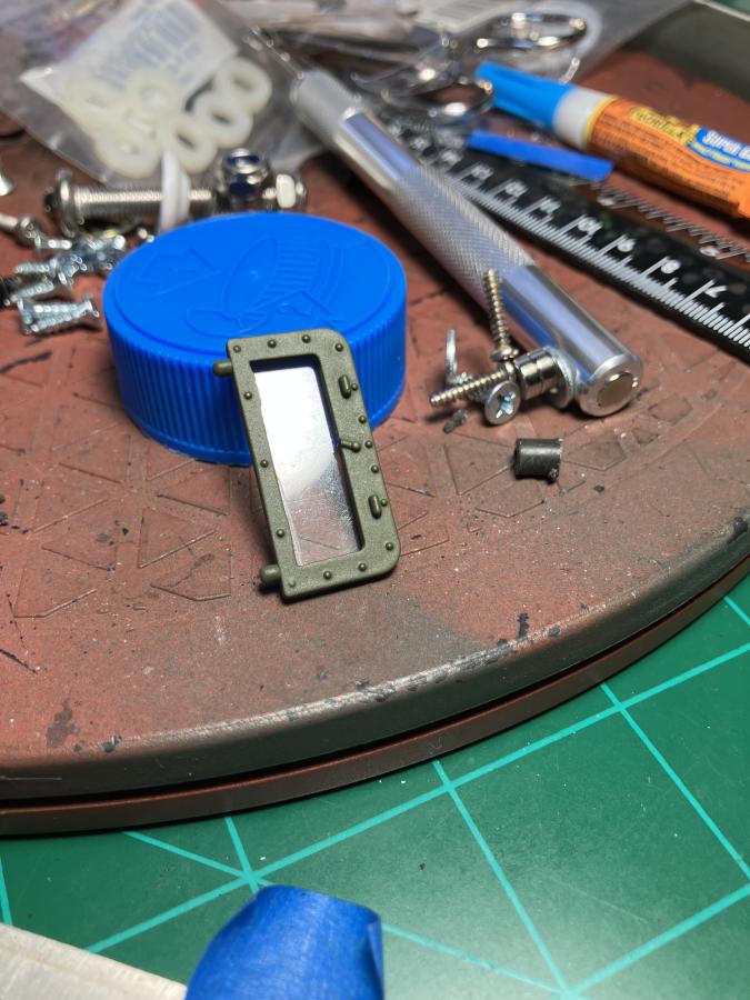 Slow progress. But progress, nonetheless. I plan on placing a screen on the air inlet and radiator air inlet. Installed a piece of plastic in the driver's foul weather windshield. I found a workable decal on the sheet that came with the Jeep I got from Rich. I also placed a plate under the crew's stowage bin. I hope it does not create an issue