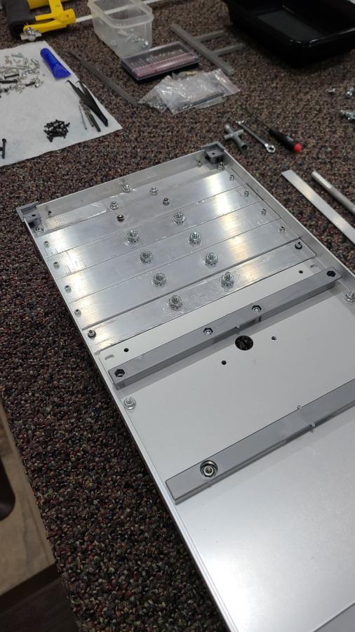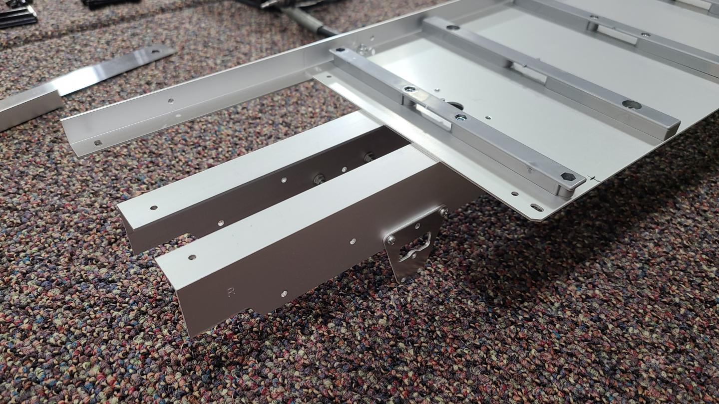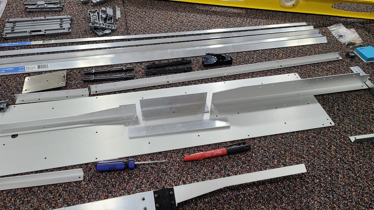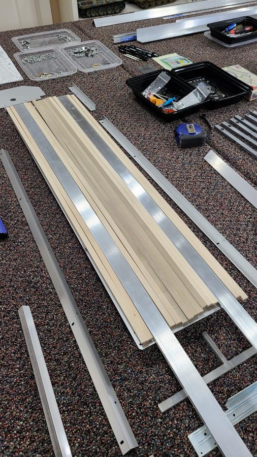 I decided to get the Tamiya flat bed trailer but felt it looked to short hooked up to the Grand Hauler. So here is what I have done to add about 6 inches to it. I took the front and rear aluminum bars and added them to the sides. That way it looked stock and matched what was already being used. I got aluminum flat bar from Home Depot and filled in the addition to the rear. Cut the main frame side rails and added some larger L bar in between the cuts I made. This kept the front and rear of the main side rails stock for the predrilled holes to work. I will also add 1 inch aluminum flat bar to the bed so I will have enough of the stock wood strips to fill in what is left over. Hope the photos help to explain.