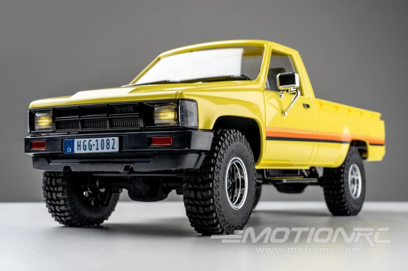 The FMS Toyota Hilux Pickup 1/18 Scale 4WD Crawler RTR from Motion RC is an ideal choice for scale adventure, offering working and static details that create an exceptional modeling experience! This officially-licensed Toyota icon includes features such as realistic LED light set with headlights, turn signals, and brake lights. The injection-molded, rigid plastic body contains scale details such as a model year-accurate (1983) front grille, bumpers, and plated wheels and side mirrors. The opening tailgate provides access to a generous bed that can be filled with your choice of payload or other scale accessories. Even the famous yellow color scheme with tri-color stripe is accurately reproduced and then painted with a protective clear coat to maintain a classic factory appearance. Full interior details include a realistic front seats and dashboard that complement this truly exceptional scale model.