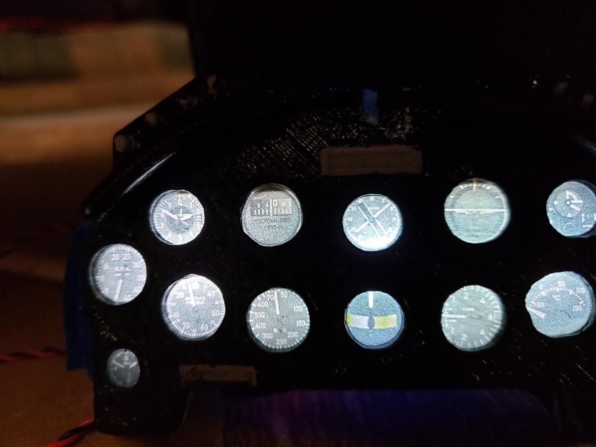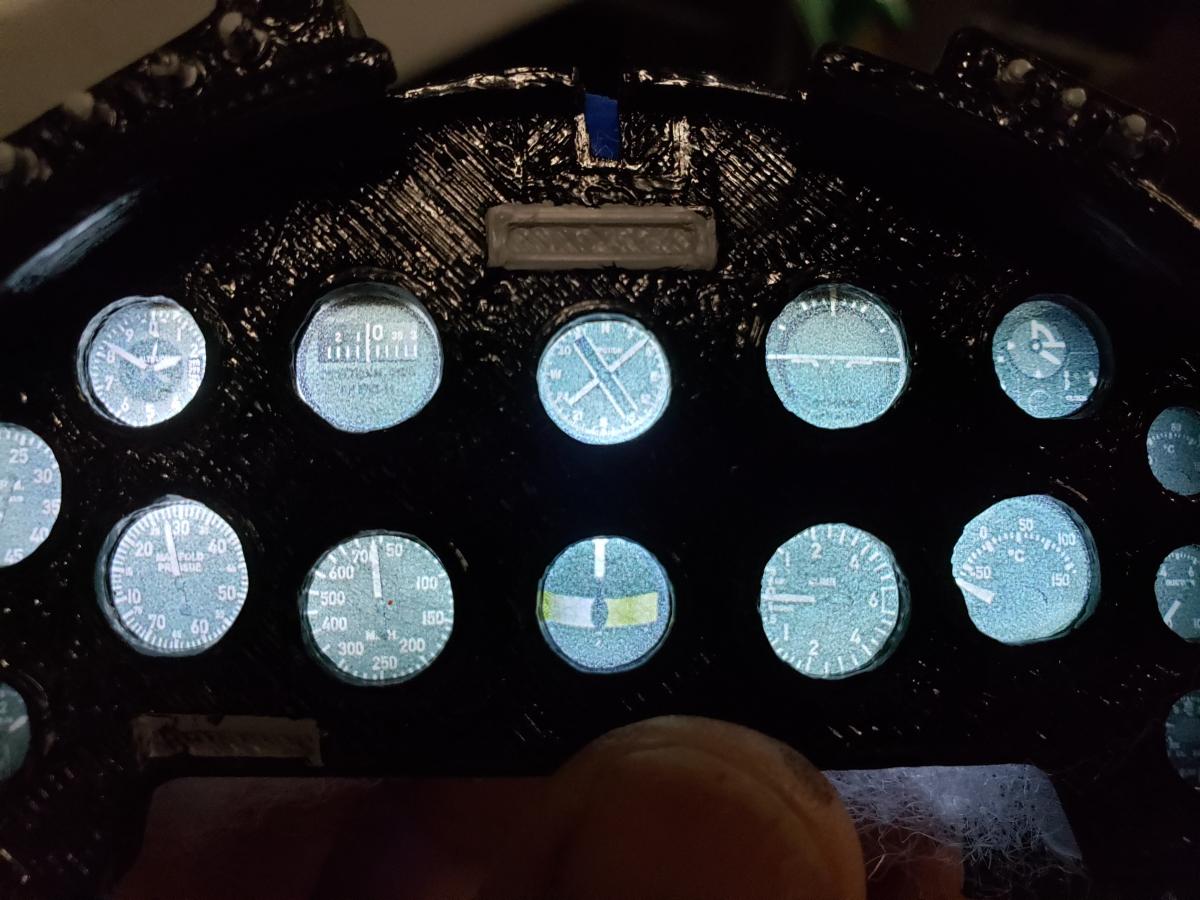 I had Callie create the gauges (Graphics) on a clear background from the set that she currently makes, specifically for doing this. I built a back plate and sides from balsa for the dashboard. The sides are 1/4 inch between the dashboard and the backing plate. I have 3 hole drilled into the balsa for the LEDs. I also filled the in between space with a "poly fill" like is used when making stuffed animals. By putting the "poly fill" in between the LEDs and and the dashboard it reduces and eliminates the "hot spots" that the LEDs normally produce. The "poly fill" acts like a defuser to spread the light over a broader area. Since the LEDs don't get hot there is no fear of burning. I soldered the LEDs to the wiring and put connectors on the ends that fix right into the connectors on the blue Motion RC Blue colored E1712 controller, which the Corsair comes with.